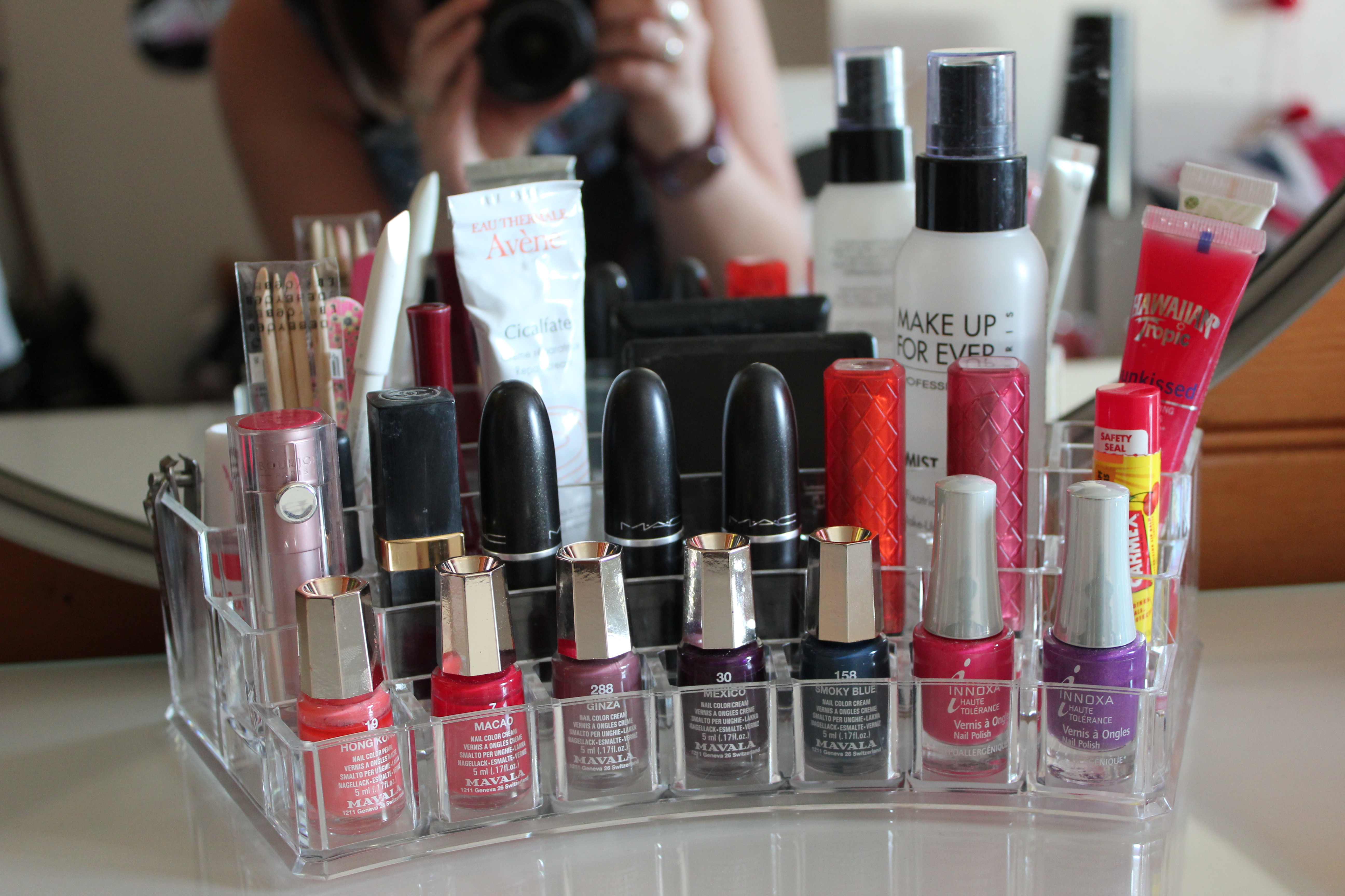 Alors voilà à quoi mon premier présentoir ressemble, il y a 15 petits compartiments sur le devant et derrière il y en a un grand et 3 plus petits mais ces 4 là sont profonds. Je suis super contente de ce rangement-ci c’est juste super pratique pour mettre les produits dont vous vous servez souvent voir quotidiennement. Personnellement j’ai dédié ce rangement à mes vernis mavala de la saison et deux autres de la marque innoxa, à mes rouges à lèvres préférés, et à quelques autres petites choses :