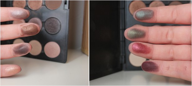 Parlons maintenant de fards à paupières MAC que j’aime énormément en particulier pour l’automne, pour les nudes (image de gauche) on a de haut en bas : Satin taupe, Mulch, Smut, et All that glitters.