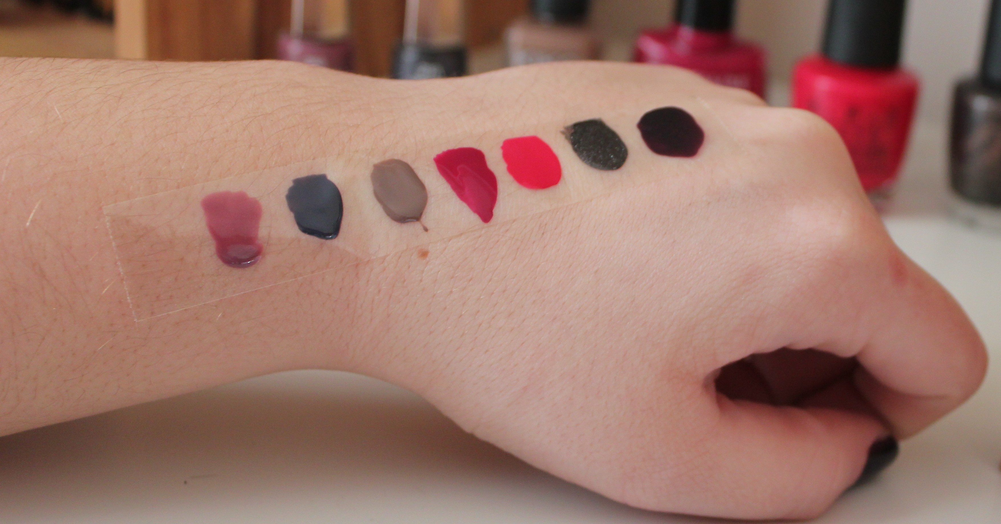 MAVALA n°288 Ginza ; MAVALA n°218 Minsk ; KIKO n°322 ; GEMEY MAYBELLINE n°265 ; OPI Dutch tulip ; OPI My private jet ; BOURJOIS n°9.